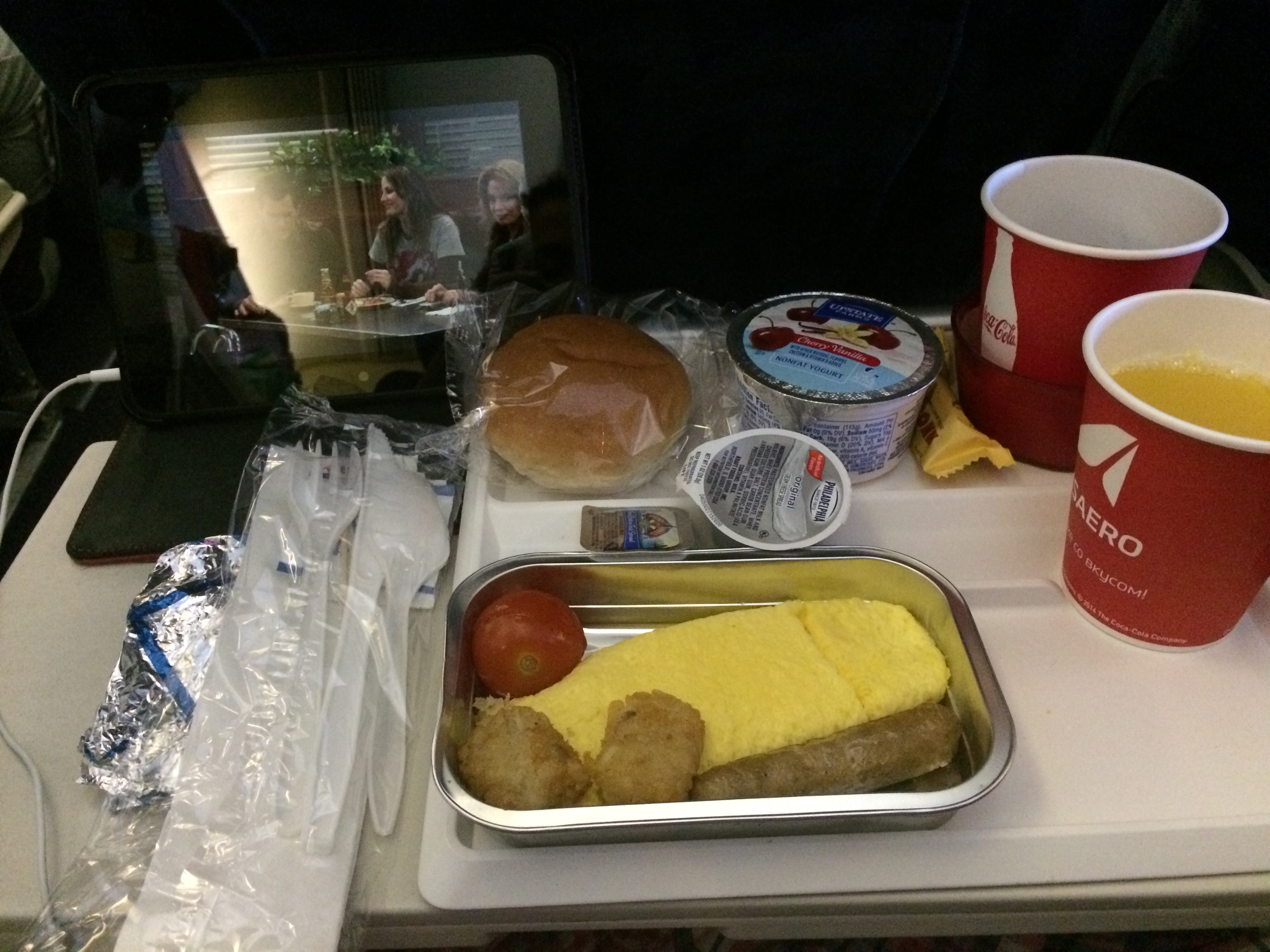 The seats were very small, even for my 5’6″ frame there was hardly any leg room. One small note – the airline referred to our ticket class as “Economy/Tourist” which I found a little funny. Come tour our plane! Take photos! But be careful – as you explore the cabin you will probably step on one of the densely packed passengers. The flight was delayed even more before we took off, pretty much ensuring that I would miss my connection in Moscow. Knowing there was little I could do to speed up the plane, I relaxed and explored the entertainment system. Five seconds later I realized that the “system” was just a 3″ x 5″ blue screen with a map of the world and the plane’s relative position within the world. No movies, music or TV for the 9 hour flight. I settled in and tried to sleep instead, but was woken up an hour in by a strange feeling for me – I was hot! I am never hot, and am frequently made fun of for bringing a sweater out on a summer day with temperature in the 80s. The plane was sweltering, and everyone I could see was fanning themselves and trying as hard as possible to be comfortable. Uh oh! At that point the flight attendant came around with food, which I ate a little of and just mostly feigned sleep for the remaining time in the air.